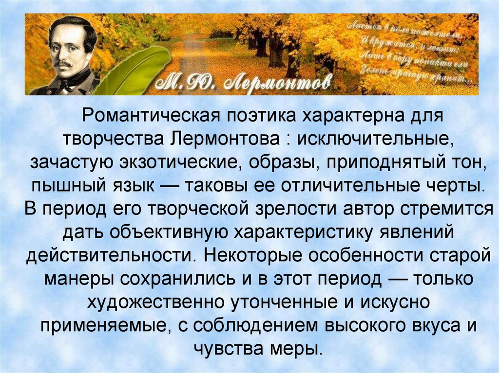 Романтическая поэтика характерна длятворчества Лермонтова : исключительные,