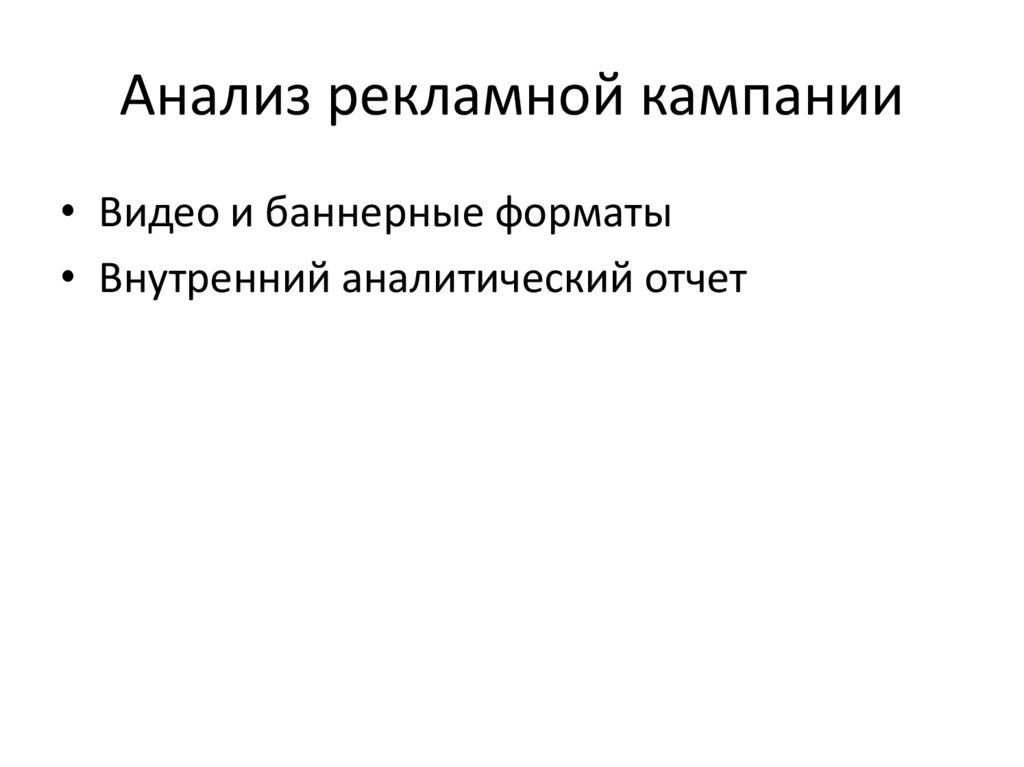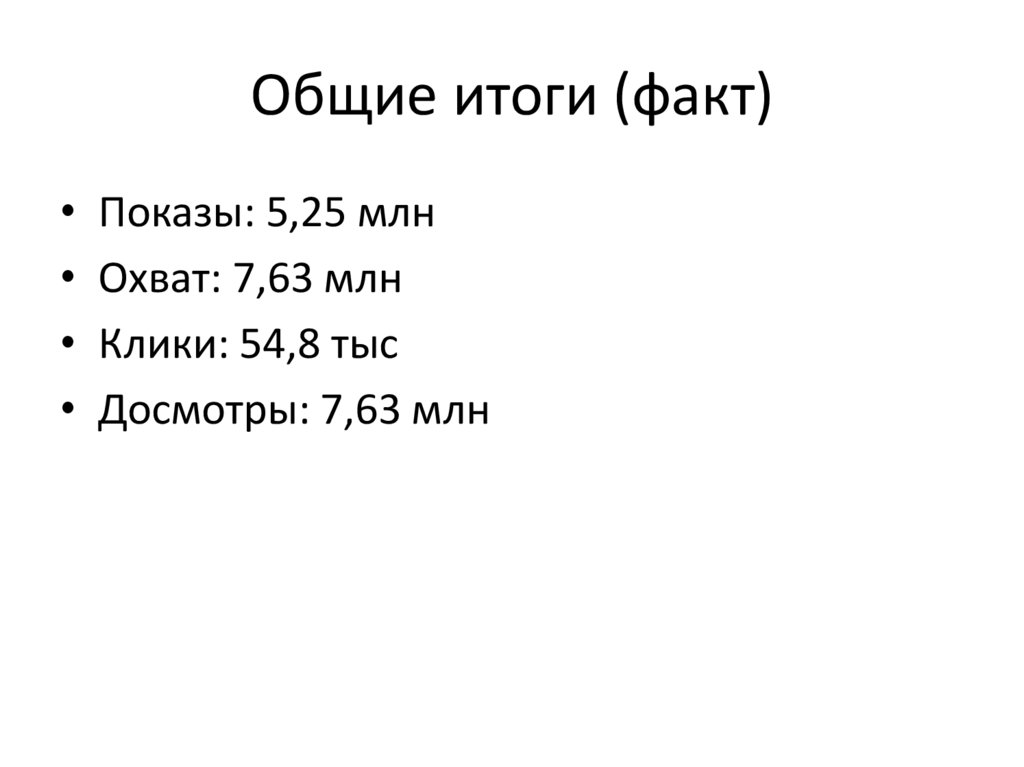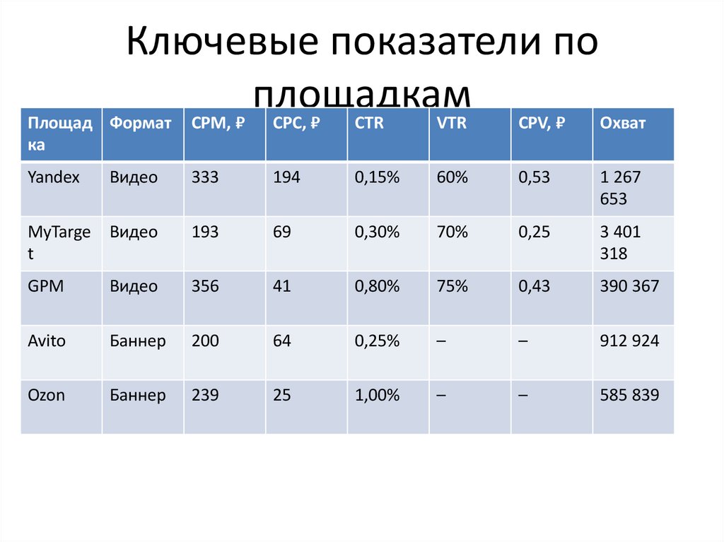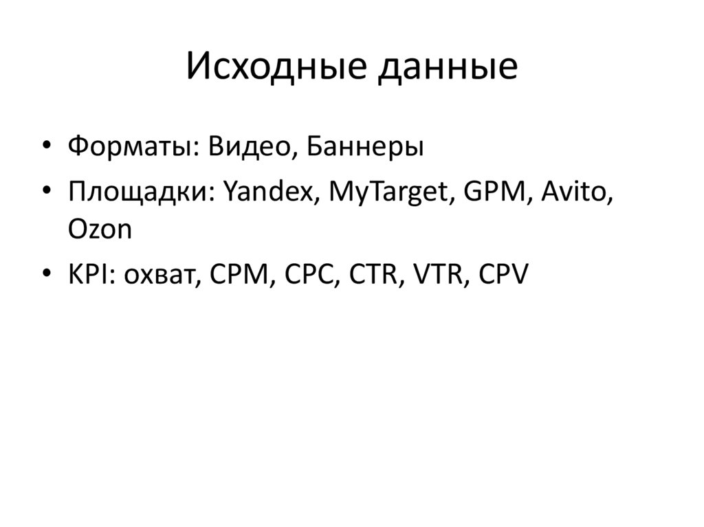 • KPI: охват, CPM, CPC, CTR, VTR, CPV