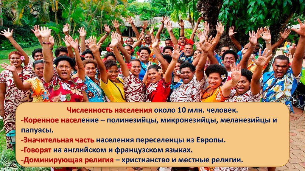 Численность населения около 10 млн. человек.-Коренное население – полинезийцы, микронезийцы, меланезийцы и