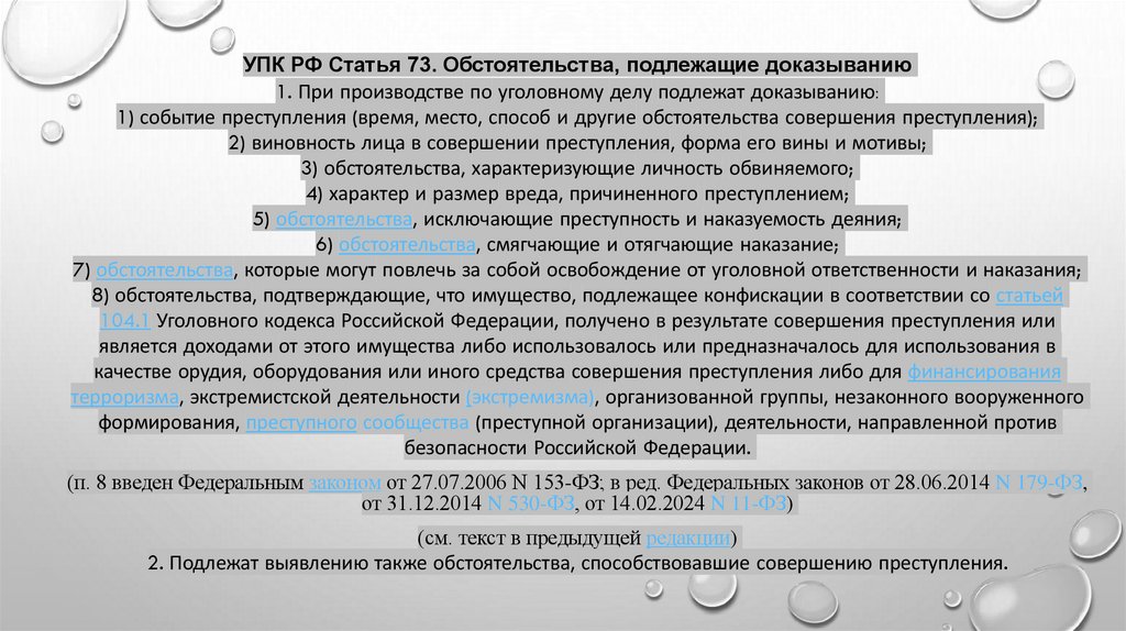УПК РФ Статья 73. Обстоятельства, подлежащие доказыванию1. При производстве по уголовному делу подлежат доказыванию: