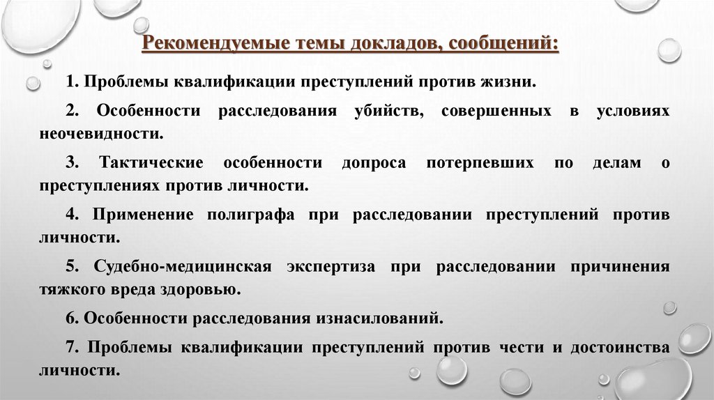 Рекомендуемые темы докладов, сообщений:1. Проблемы квалификации преступлений против жизни.