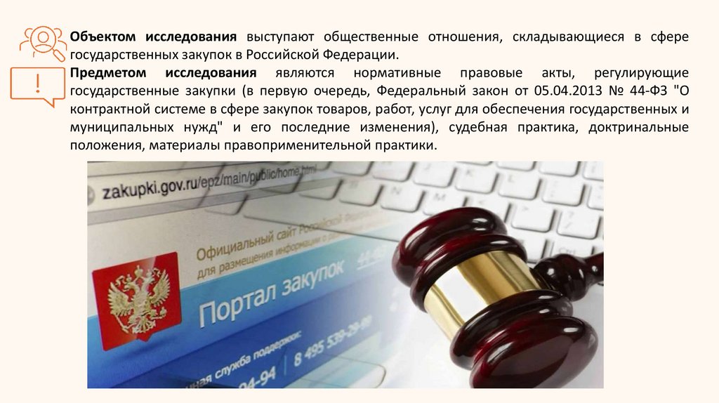 Объектом исследования выступают общественные отношения, складывающиеся в сферегосударственных закупок в Российской Федерации.