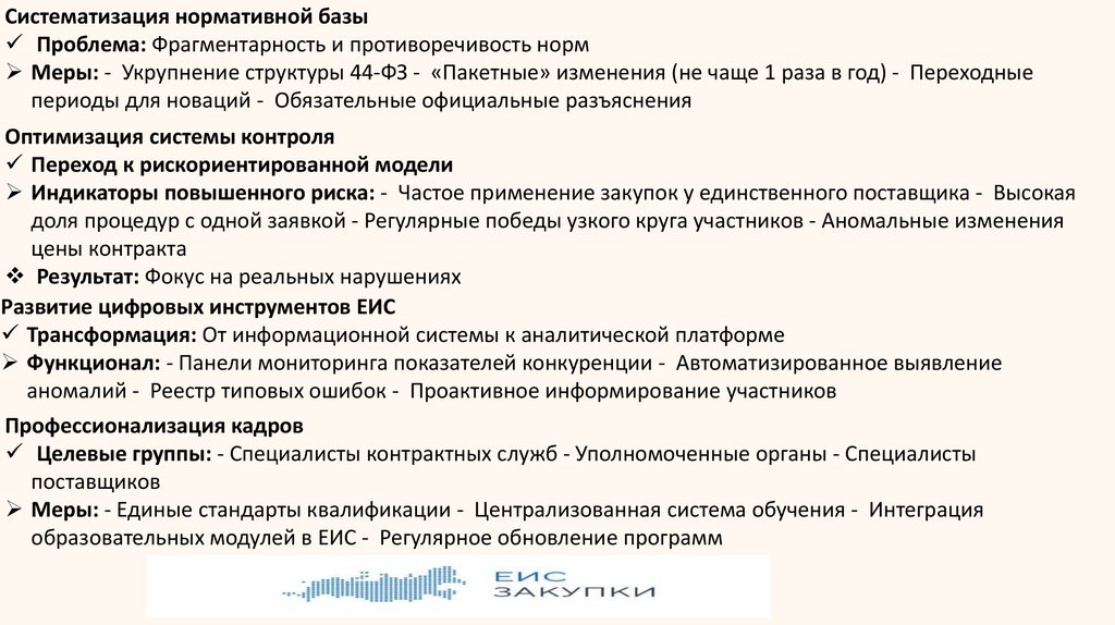 Меры: - Укрупнение структуры 44-ФЗ - «Пакетные» изменения (не чаще 1 раза в год) - Переходные