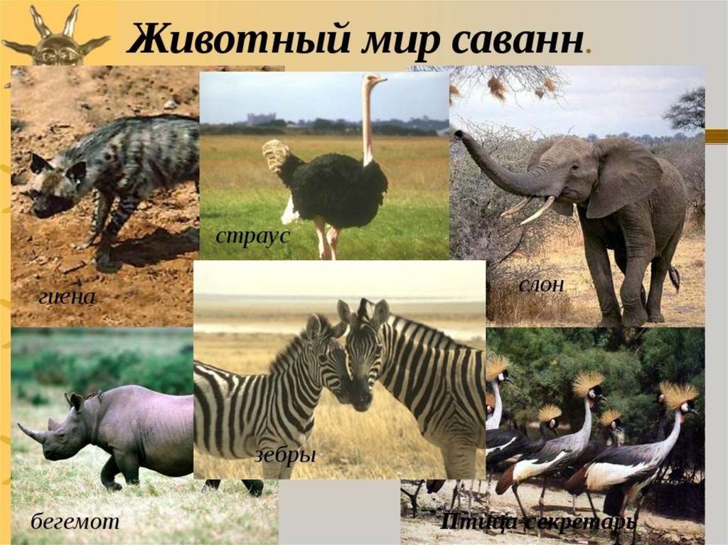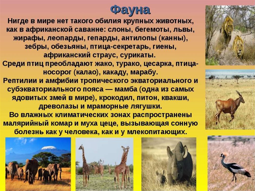 • Саванны богаты растительной пищей, поэтомутам много крупных травоядных животных. Эти