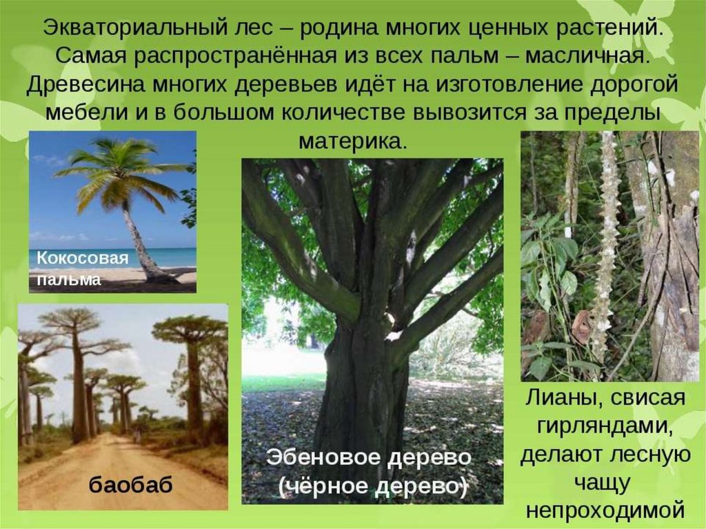 6. Влажный экваториальный лес- это природная зона, для которой характерна вечнозеленая растительность, расположенная ярусами