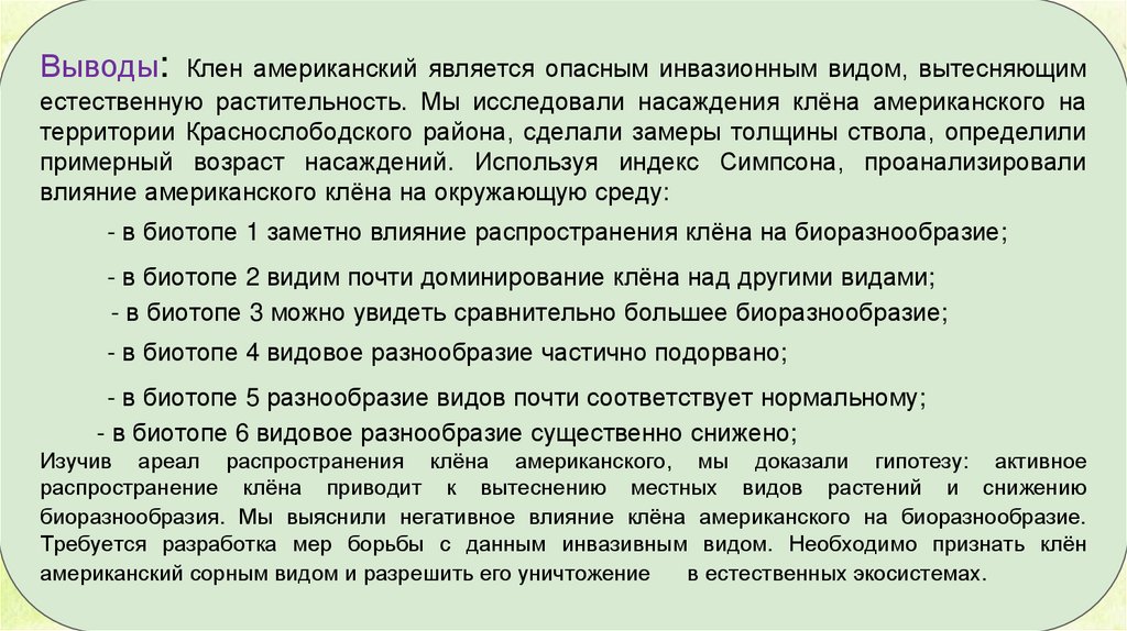 биоразнообразия. Мы выяснили негативное влияние клёна американского на биоразнообразие.