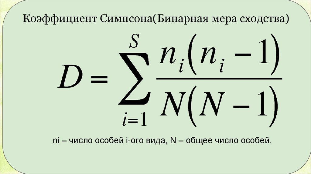 Коэффициент Симпсона(Бинарная мера сходства)ni – число особей i-ого вида, N – общее число особей.