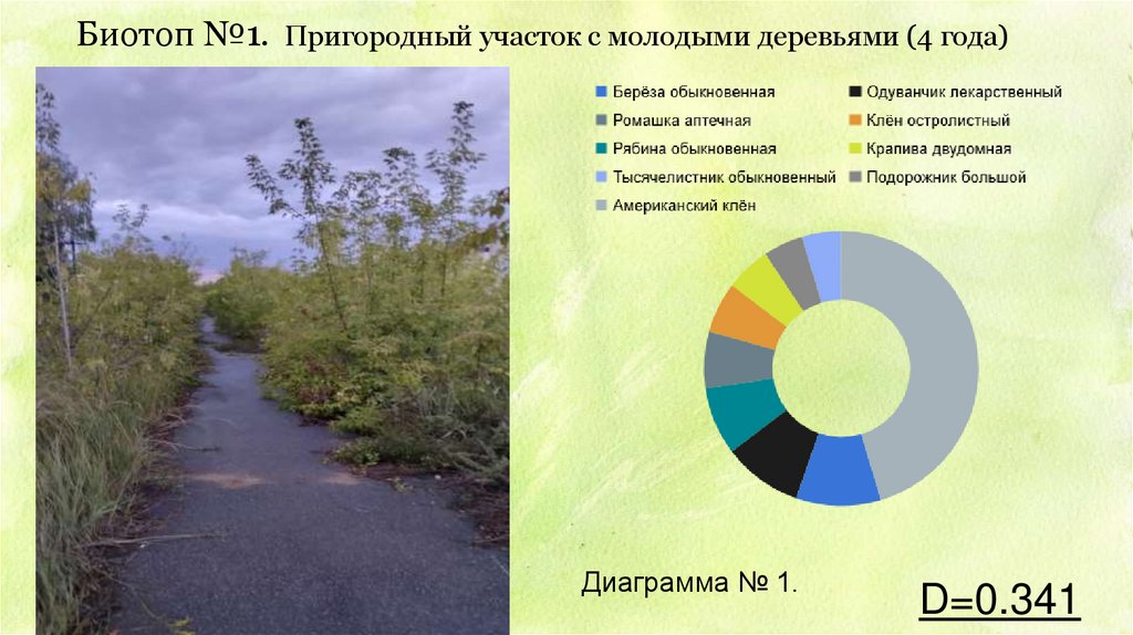 Биотоп №1. Пригородный участок с молодыми деревьями (4 года)Диаграмма № 1.