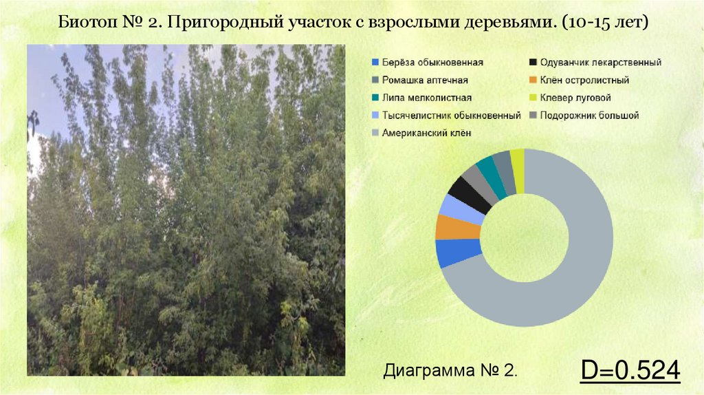 Биотоп № 2. Пригородный участок с взрослыми деревьями. (10-15 лет)Диаграмма № 2.
