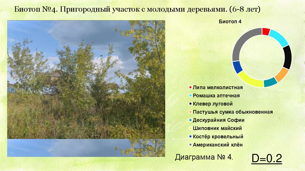 Биотоп №4. Пригородный участок с молодыми деревьями. (6-8 лет)Биотоп 4
