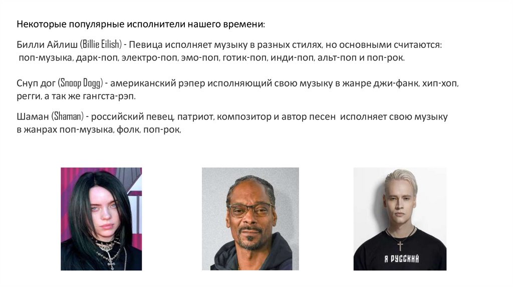 Некоторые популярные исполнители нашего времени:Билли Айлиш (Billie Eilish) - Певица исполняет музыку в разных стилях, но основными считаются: