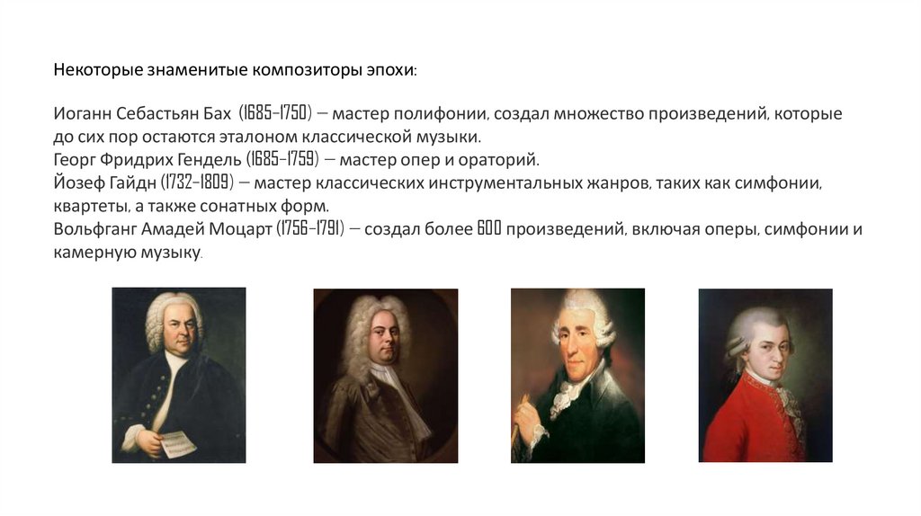 Некоторые знаменитые композиторы эпохи:Иоганн Себастьян Бах (1685–1750) — мастер полифонии, создал множество произведений, которые