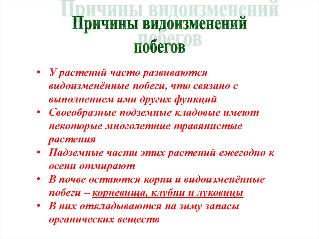 • У растений часто развиваютсявидоизменённые побеги, что связано с