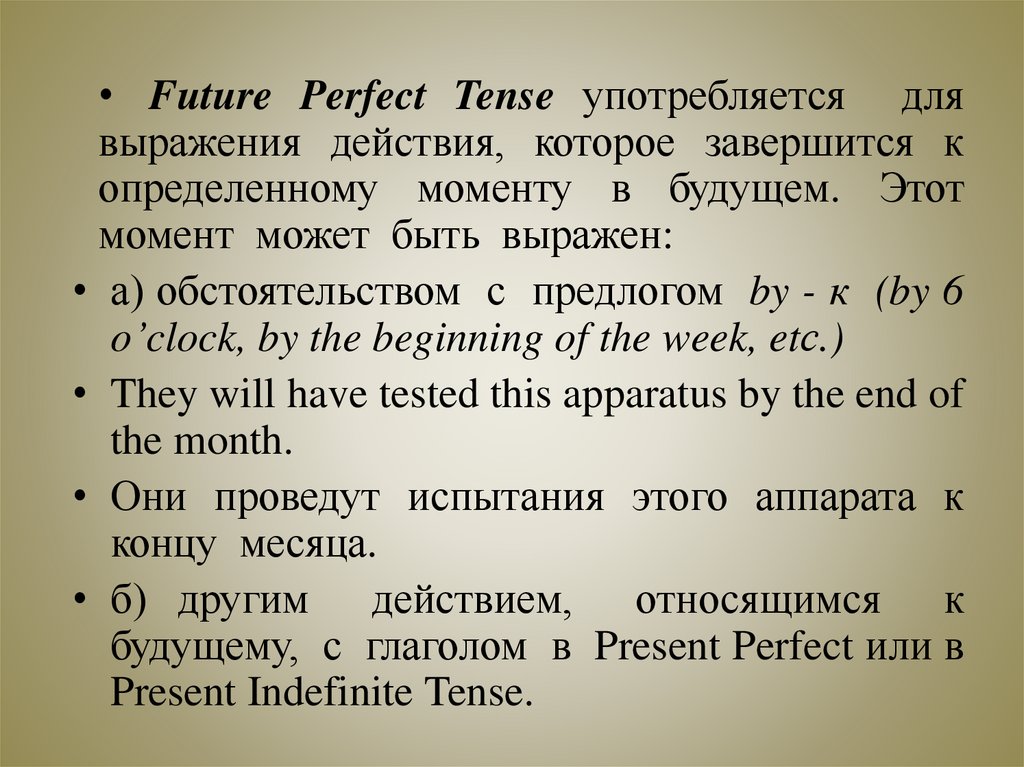 • Future Perfect Tense употребляется длявыражения действия, которое завершится к