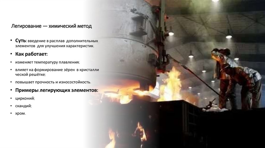 Легирование — химический метод• Суть: введение в расплав дополнительных