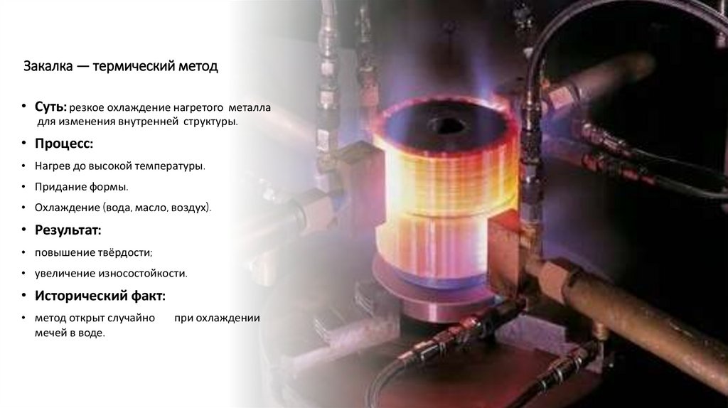 Закалка — термический метод• Суть: резкое охлаждение нагретого металла