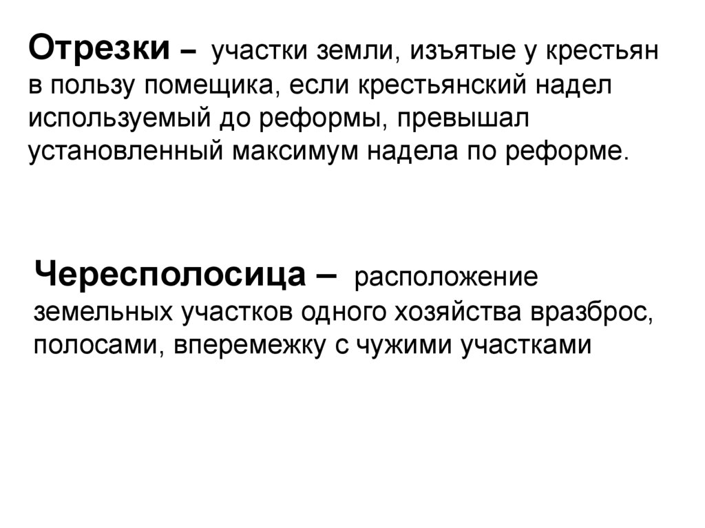 Отрезки – участки земли, изъятые у крестьянв пользу помещика, если крестьянский надел