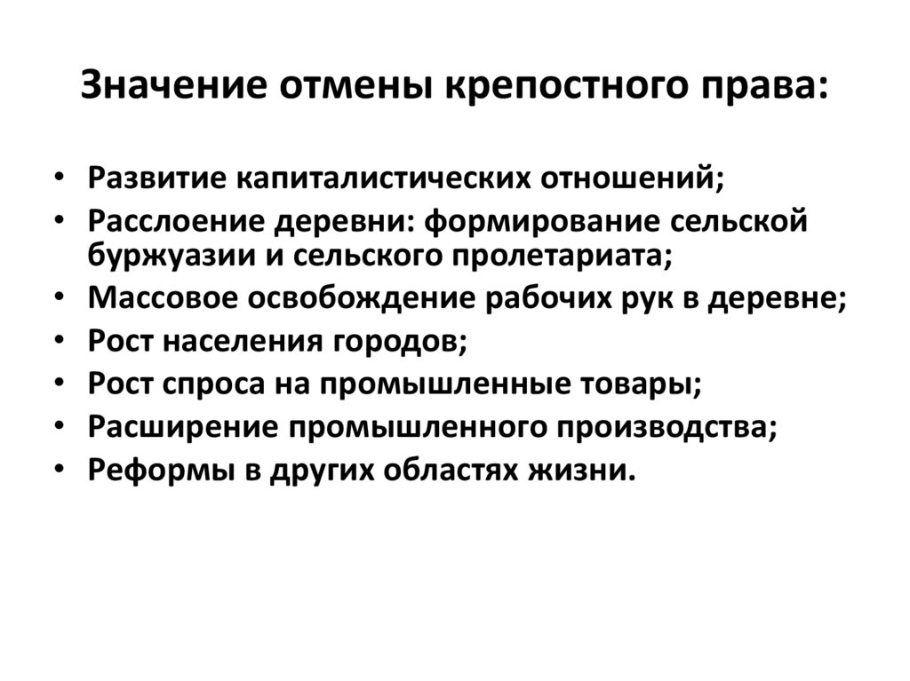 Значение отмены крепостного права:• Развитие капиталистических отношений;