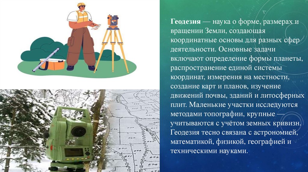 Геодезия — наука о форме, размерах ивращении Земли, создающая