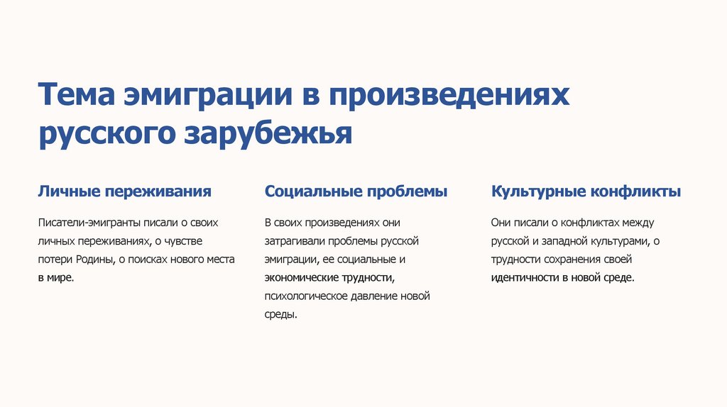 темы русской жизни, эмиграции, духовных поисков.