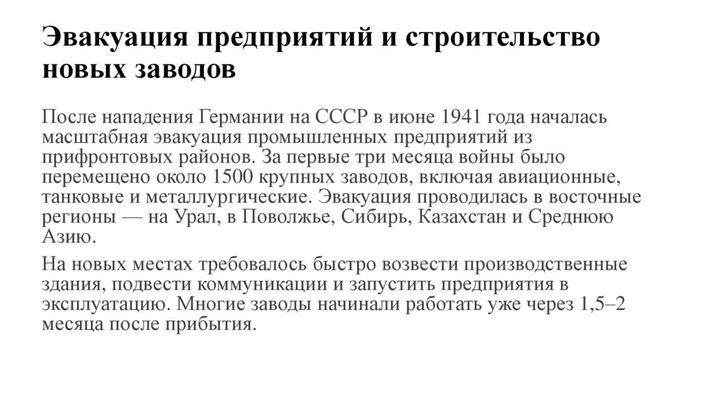 Эвакуация предприятий и строительствоновых заводов