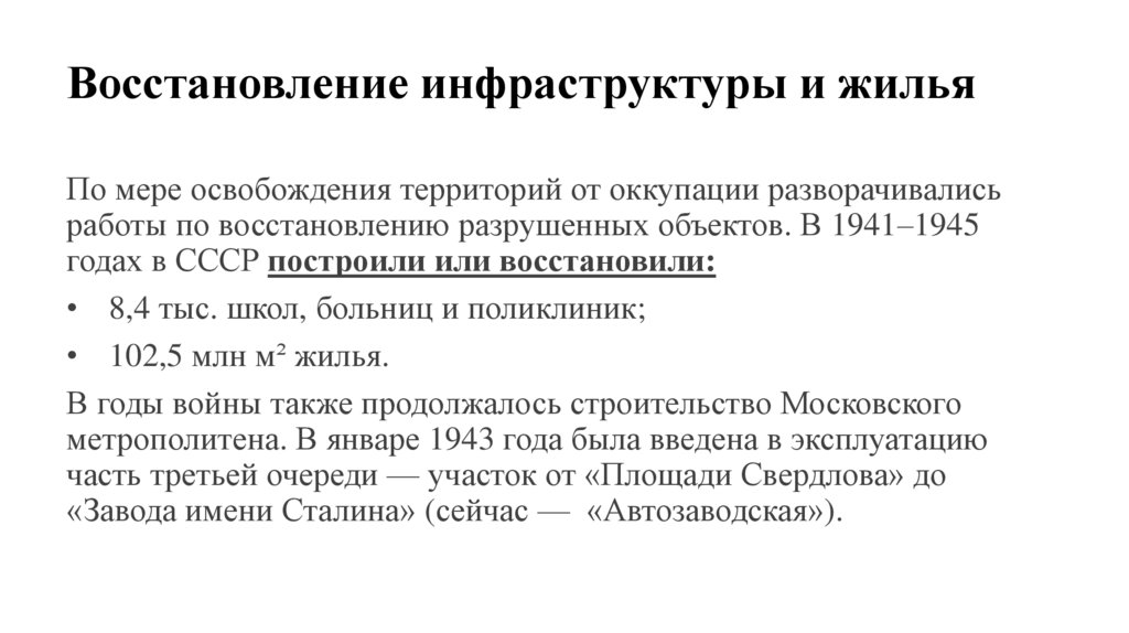 работы по восстановлению разрушенных объектов. В 1941–1945