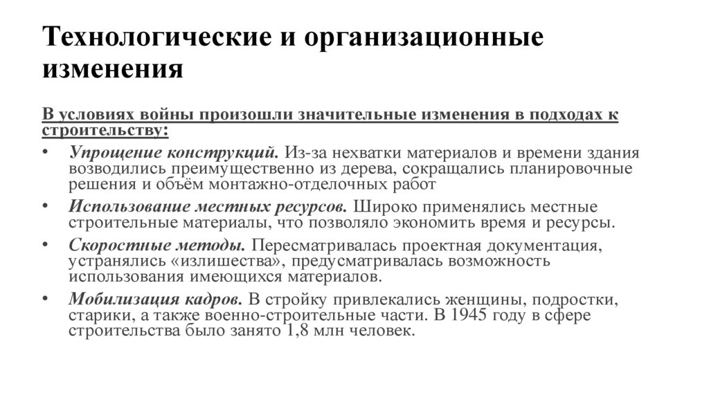 • Упрощение конструкций. Из-за нехватки материалов и времени здания