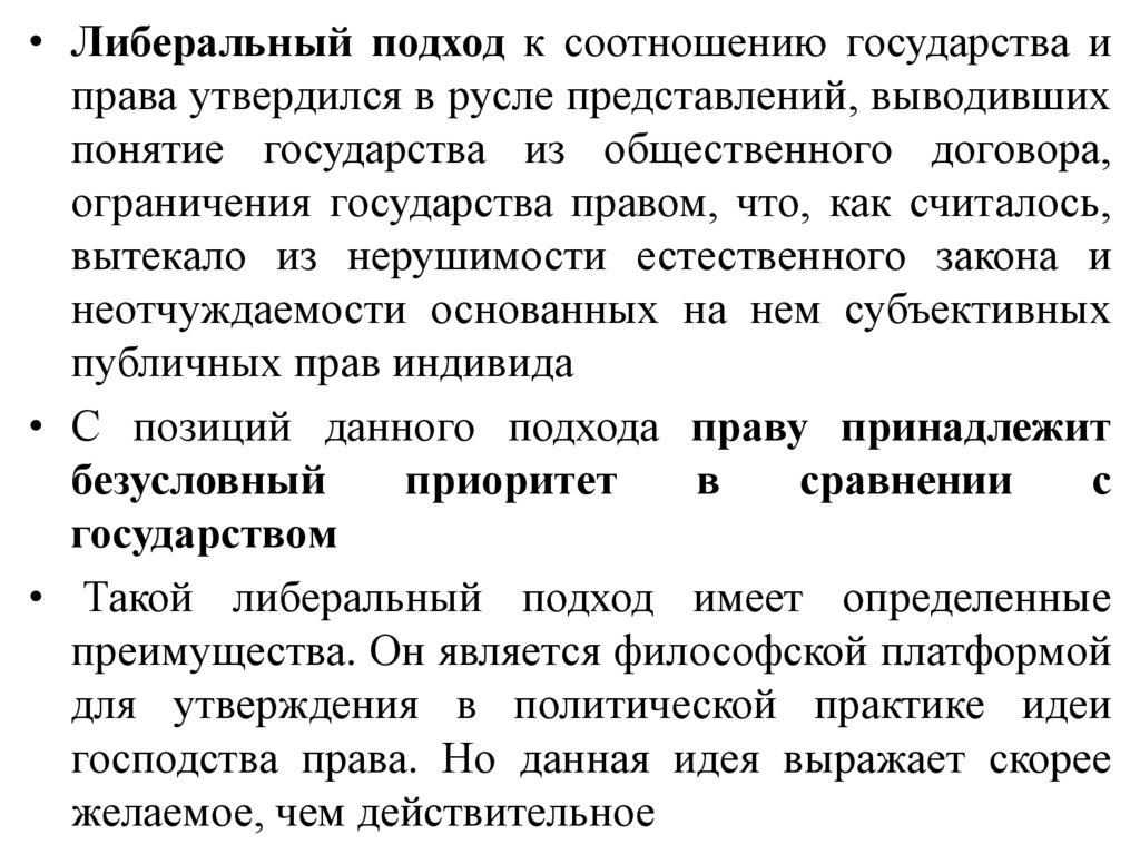 • Либеральный подход к соотношению государства иправа утвердился в русле представлений, выводивших