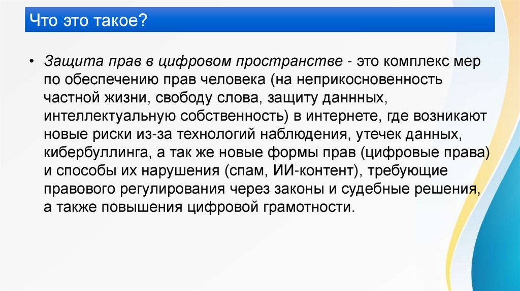 Что это такое?• Защита прав в цифровом пространстве - это комплекс мер