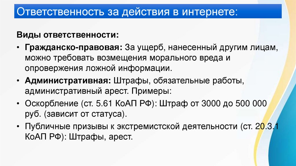 Ответственность за действия в интернете:Виды ответственности: