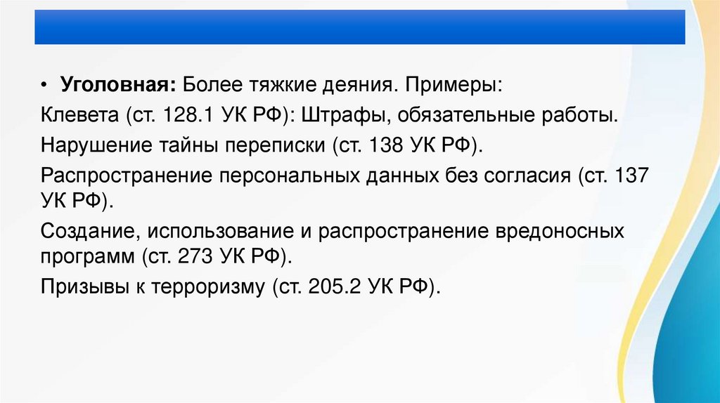 • Уголовная: Более тяжкие деяния. Примеры:Клевета (ст. 128.1 УК РФ): Штрафы, обязательные работы.