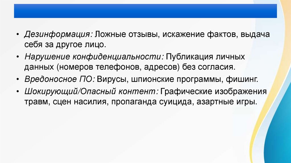 • Дезинформация: Ложные отзывы, искажение фактов, выдачасебя за другое лицо.