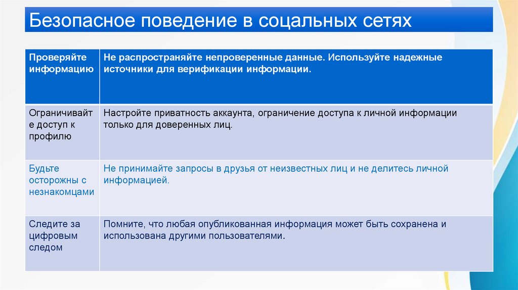 Безопасное поведение в соцальных сетяхПроверяйте
