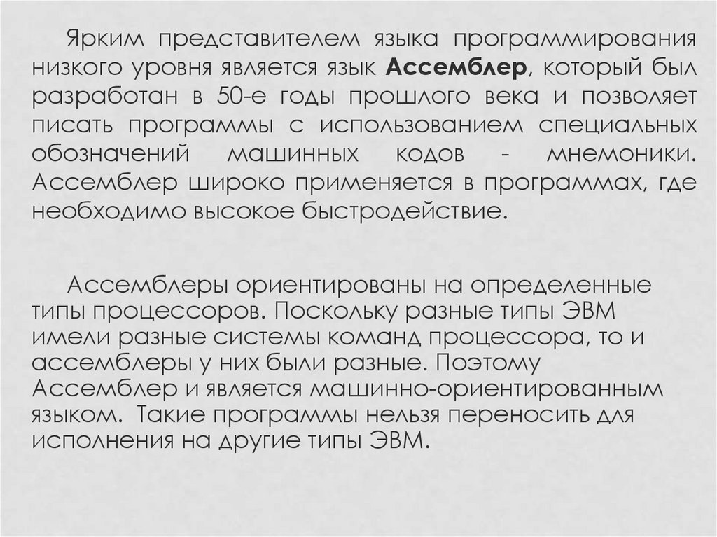 Ярким представителем языка программированиянизкого уровня является язык Ассемблер, который был