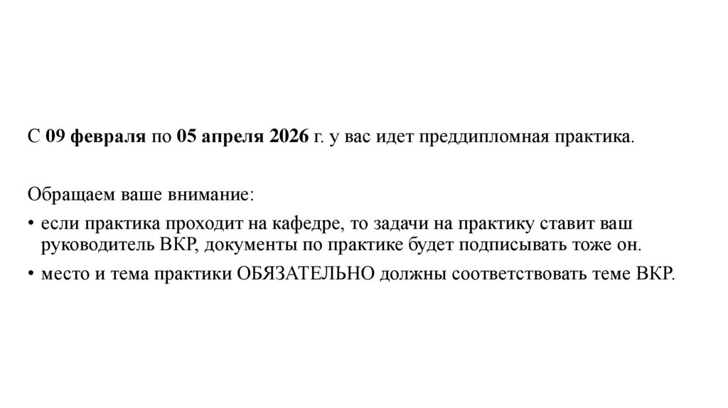 С 09 февраля по 05 апреля 2026 г. у вас идет преддипломная практика.Обращаем ваше внимание: