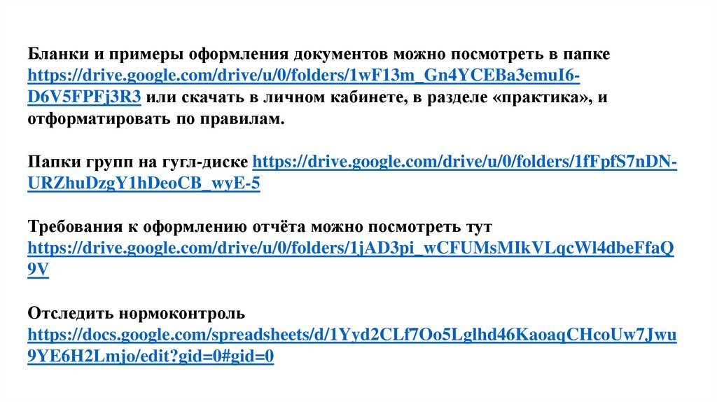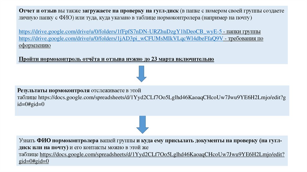 Отчет и отзыв вы также загружаете на проверку на гугл-диск (в папке с номером своей группы создаетеличную папку с ФИО) или туда, куда указано в таблице нормоконтролера (например на почту)