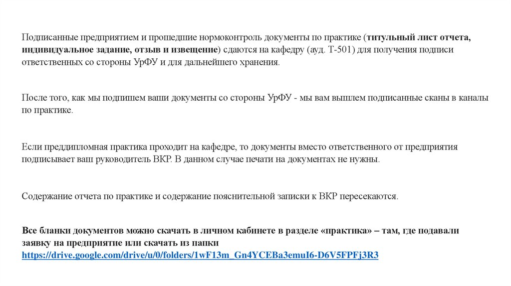 Подписанные предприятием и прошедшие нормоконтроль документы по практике (титульный лист отчета,индивидуальное задание, отзыв и извещение) сдаются на кафедру (ауд. Т-501) для получения подписи