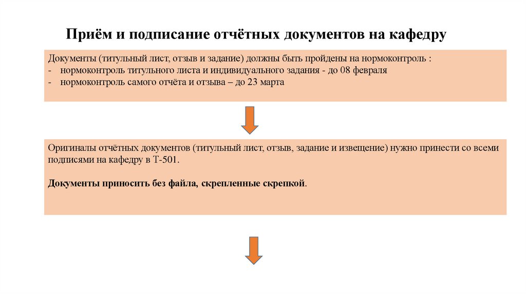 Приём и подписание отчётных документов на кафедруДокументы (титульный лист, отзыв и задание) должны быть пройдены на нормоконтроль :
