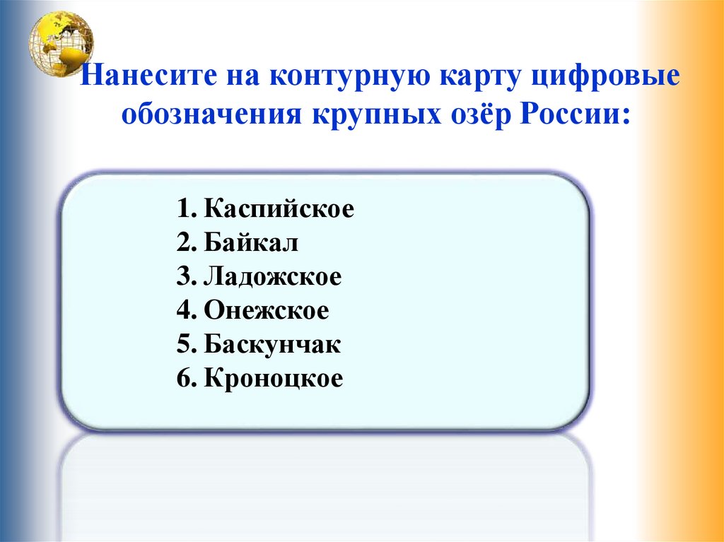 Нанесите на контурную карту цифровыеобозначения крупных озёр России: