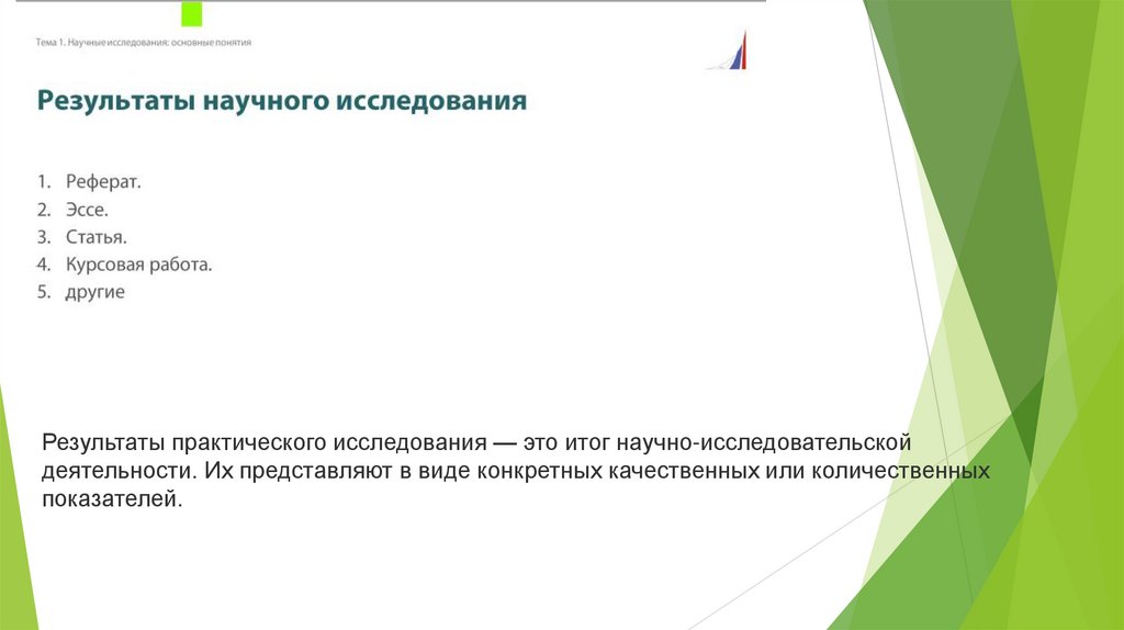 Результаты практического исследования — это итог научно-исследовательскойдеятельности. Их представляют в виде конкретных качественных или количественных