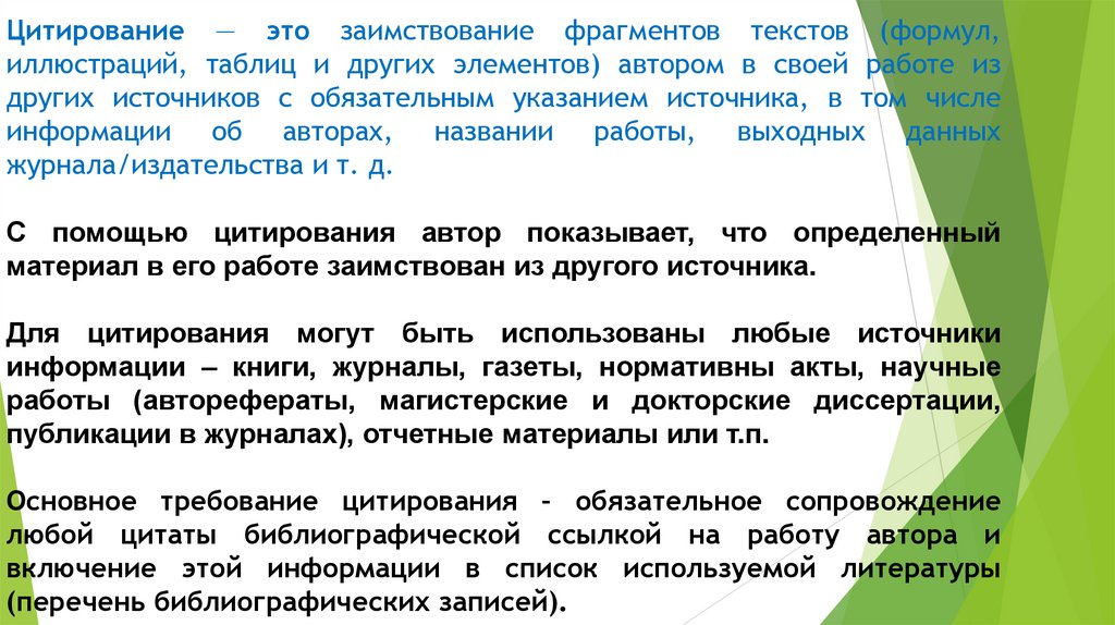 Цитирование — это заимствование фрагментов текстов (формул,иллюстраций, таблиц и других элементов) автором в своей работе из