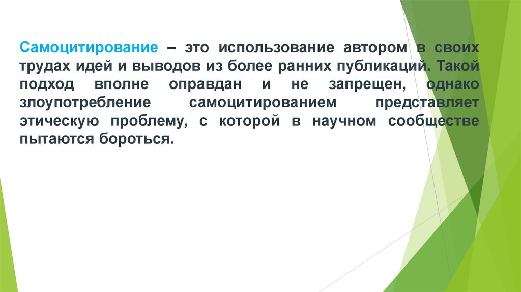 Самоцитирование – это использование автором в своихтрудах идей и выводов из более ранних публикаций. Такой