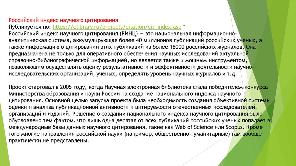 Российский индекс научного цитирования (РИНЦ) — это национальная информационноаналитическая система, аккумулирующая более 40 миллионов публикаций российских ученых, а