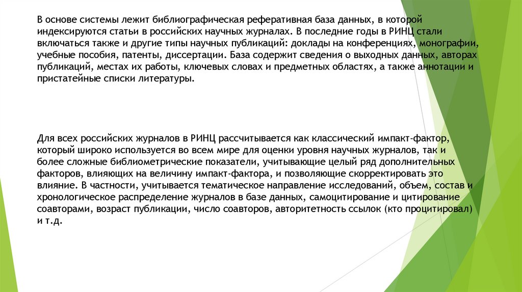 В основе системы лежит библиографическая реферативная база данных, в которойиндексируются статьи в российских научных журналах. В последние годы в РИНЦ стали