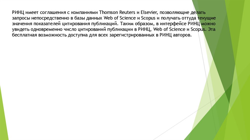 РИНЦ имеет соглашения с компаниями Thomson Reuters и Elsevier, позволяющие делатьзапросы непосредственно в базы данных Web of Science и Scopus и получать оттуда текущие