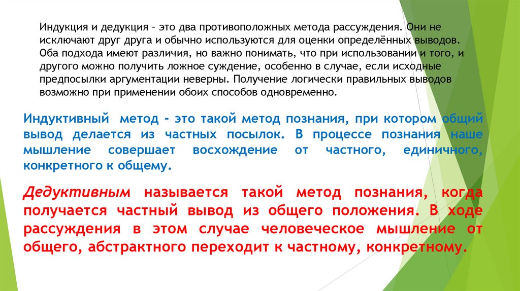 Индукция и дедукция – это два противоположных метода рассуждения. Они неисключают друг друга и обычно используются для оценки определённых выводов.