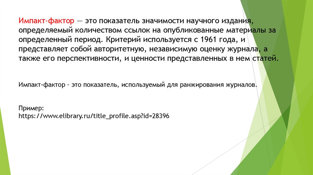 Импакт-фактор — это показатель значимости научного издания,определяемый количеством ссылок на опубликованные материалы за