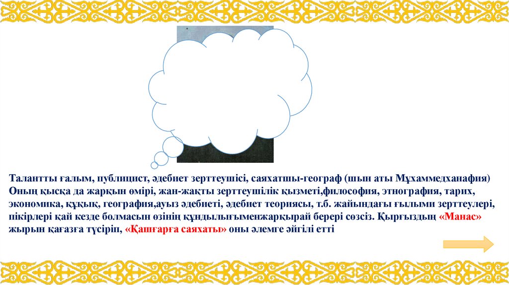 Талантты ғалым, публицист, әдебиет зерттеушісі, саяхатшы-географ (шын аты Мұхаммедханафия)Оның қысқа да жарқын өмірі, жан-жақты зерттеушілік қызметі,философия, этнография, тарих,