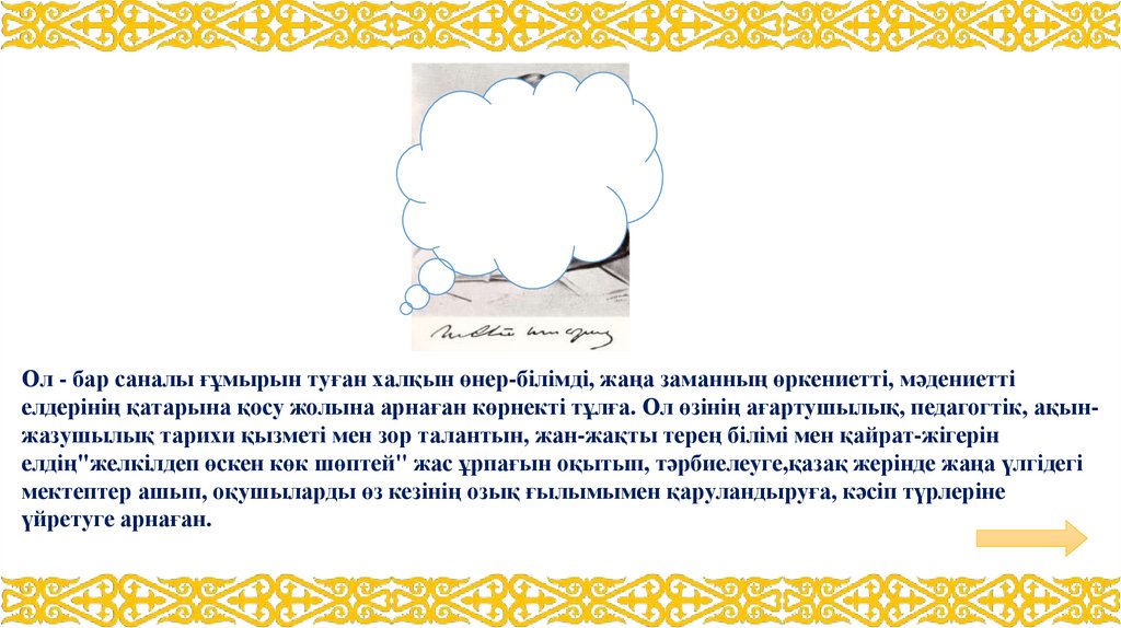 Қазақ әдебиеті мен әдебиеттану ғылымының, тіл білімінің атасы, ұлы түрлендіруші-реформаторыатанған ол өзінің алдындағы Шоқан,Ыбырай, Абайлардың ағартушылық, демократтық