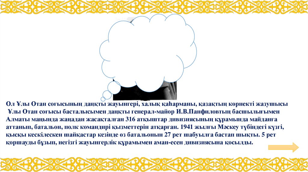 Ол Ұлы Отан соғысының даңқты жауынгері, халық қаһарманы, қазақтың көрнекті жазушысыҰлы Отан соғысы басталысымен даңқты генерал-майор И.В.Панфиловтың басшылығымен